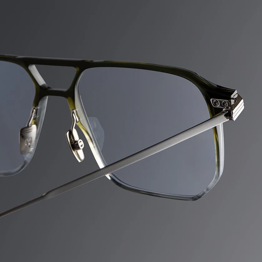 Presenting a new take on Cutler and Gross's acetate artistry, the 0006 optical is a combination frame with ultra-light precious metal temples. It is handcrafted to a navigator silhouette with polished grooved lugs.